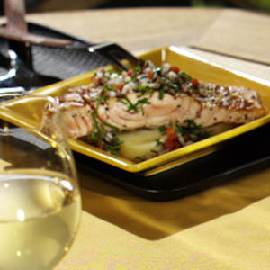 Place one salmon filet on each of four large plates. Top with a generous tablespoon of dressing and serve immediately. Serve with some freshly steamed potatoes and a crisp green salad.